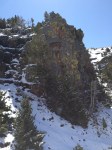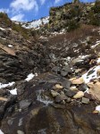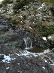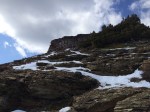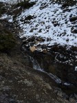 We started out going up, rather steeply, the mountain from our lovely alpine meadows. We wandered around shrubs and boulders; making our way up… straight up… It must of been made for extremely fit people because we had to stop every 20 feet to catch our breath. It was horribly difficult in the snow. There were sections that I could of sworn were at 75 or 80 degrees; it was that hard (ok, maybe it was only 60). But, we managed to get to the first visible section from below. The large waterfall from the creek.
