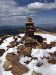 As we approached, they were more concerned with the vegetation than with us, so we were able to get quite close (enough to hear them breathing and eating). When they finally wondered who we were, they dashed off; we continued on to the summit. Someone had tried to build a small mound of rocks; so I neatly organized it into a pathetic looking Inuksuk. It marked the summit. Back down we went.