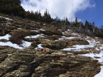 We followed the trail Billy had laid out for us. It was rather quick and direct and somewhat vertical; he wasted no time getting to the top. We crossed the creek and climbed an even steeper hill. At the top of this monster, we took a small break only to realize that little hill we just climbed was the easy part. We looked at what we had to do and we both groaned. Luckily, Billy must of known we would follow him because he took us on a slight detour; around the other side of the mountain. We didn’t get very far before we realized he was going in the wrong direction (what does he know! He’s a goat!). We turned and went straight up (because our leg’s weren’t tired enough). This section was very difficult; the high altitude, the burning leg muscles, the heavy breathing… It felt like we were being punished for something.
