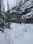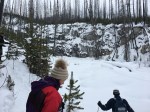 We started off trail, heading towards a canyon to the south. We had to cross a creek that wasn’t fully frozen but we found an ice bridge stable enough for us to cross. We traversed through burnt out forest and new growth for about an hour and had to cross the creek again.
