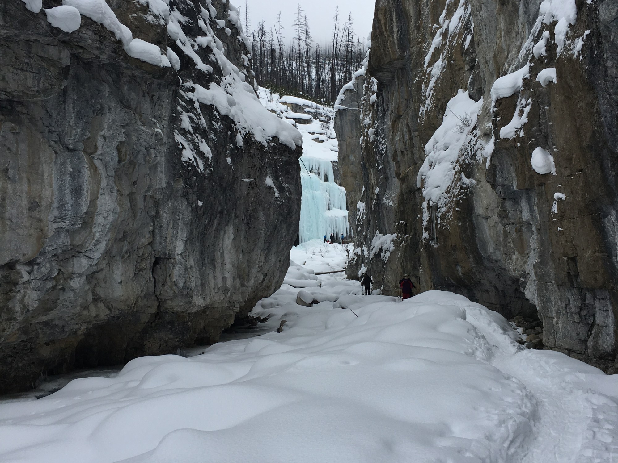 Once across the second time, we met up with a trail that went into the canyon. There we were met with a lot of ice climbers going up frozen Waterfalls. We watched for a few minutes and continued up the quickly narrowing Canyon. At one point the group stopped and I kept going, sans snowshoes. Picking my way across the mix of frozen patches and snow covered rocks was tricky but the view of the final waterfall was amazing. It was frozen on the outside but the rapidly moving water could be seen just behind. The Canyon was well worn from run off which made curtains of ice in sections.